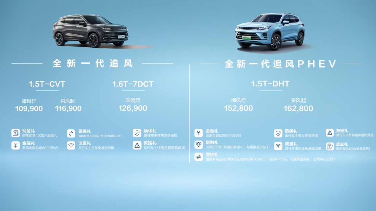 多种动力,油电随“芯” 动力方面,全新一代追风则为用户带来了更多选项,拥有1.5T,1.6T和PHEV三种版本供用户选择。1.5T动力版本搭载CVT无级变速箱。1.6T动力版本则采用1.6TGDI最强中国芯发动机,搭配7速湿式双离合变速箱的动力组合,最大功率:145kW ,最大扭矩300N·m,性能高速,响应快速,动力输出及时,为享受驾驶的用户带来更精准的操控感受和澎湃的动力体验。 它的价格也是非常的惊喜,新车共推出燃油版和PHEV版两个车型,燃油版官方指导价格为:10.99万元-12.69万元。PHEV版本官方指导价格为:15.28万元-16.28万元。更惊喜的是,在高价值购买力基础上,此次上市的全新一代星途追风也给用户带来了多重客户权益,切实做到了“懂用户所想,宠用户所需”。