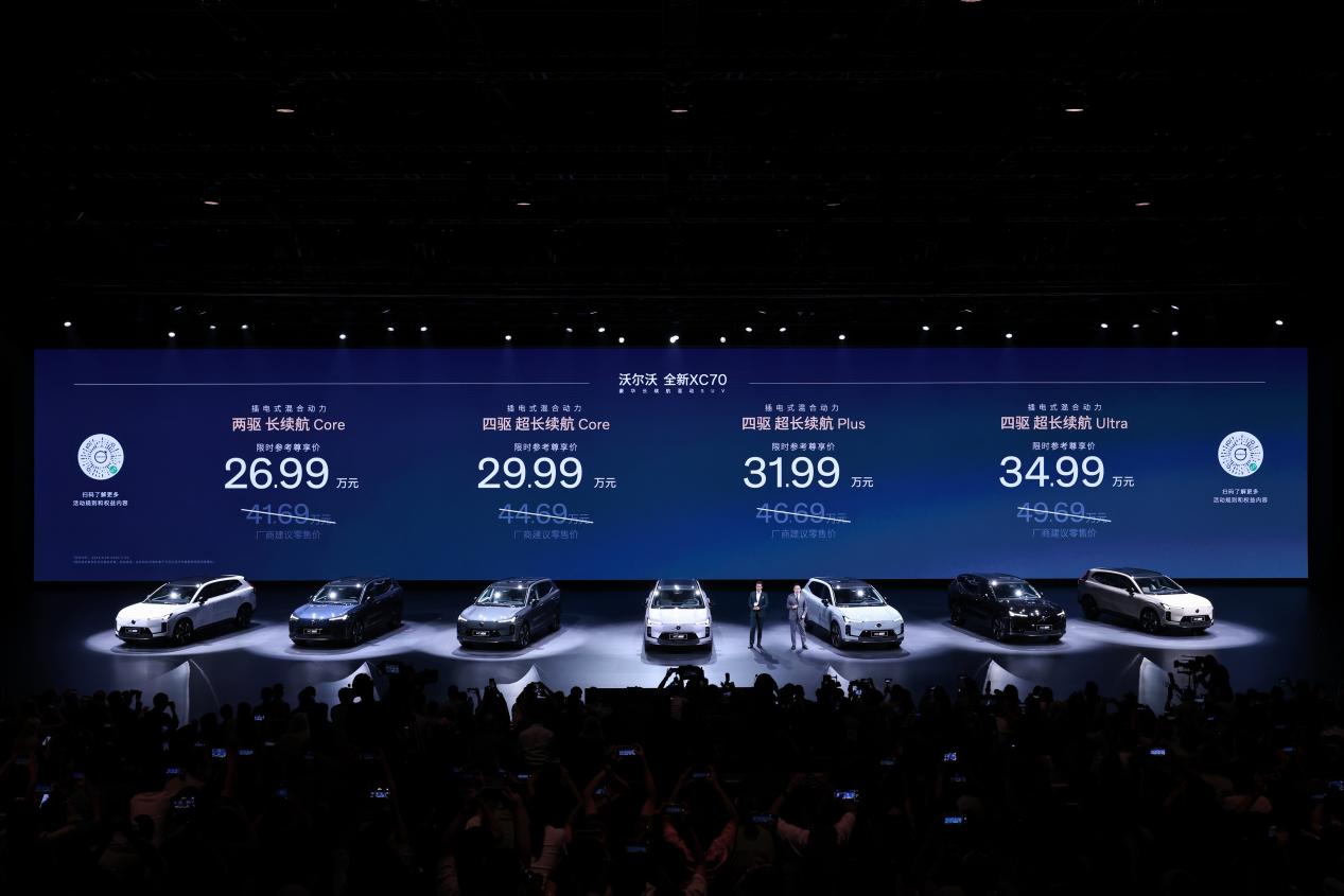 沃尔沃全新XC70全国上市,限时参考尊享价26.99万元起发表时间:2025-09-29 21:26 【2025年9月26日,上海】今日,豪华长续航混动SUV——沃尔沃全新XC70正式全国上市。新车共推出4个配置版本,限时参考尊享价26.99万元起,并提供超值五重惊喜礼。值得一提的是,发布会后签售会现场订单火爆,消费者购车热情高涨,其中咨询区、洽谈区座无虚席,试驾体验区更是排起长队,大家迫不及待体验新车,充分彰显了全新XC70强大的市场号召力与消费者的高度认可。 当晚,沃尔沃汽车品牌代言人胡歌现身发布会,与各界嘉宾共同见证沃尔沃全新XC70正式上市。胡歌表示:“对自己和家人好一点,就选沃尔沃全新XC70”。发布会现场,沃尔沃汽车集团全球高级副总裁、沃尔沃汽车亚太区总裁兼CEO袁小林表示:“XC70以全球视角洞察需求,以中国智慧引领创新,更以不变的品牌灵魂,守护每一次出发的安心。”。沃尔沃汽车大中华区销售公司总裁于柯鑫表示:“安全、健康、环保,是XC70始终坚守的品牌基因。”。 超级混动全能实力,全面满足用车需求 沃尔沃全新XC70以全能实力开启豪华超混新篇章,全面满足了用户在日常通勤、长途自驾、周末出游等场景的丰富用车需求。新车采用“四擎四驱”动力结构,即1.5T混动专用发动机,P1+P2电机同轴布局,协同3DHT混动专用变速箱,搭配后桥P4电机,可实现智能四驱。并可智能切换直驱、串联、并联等7种混动工作模式,可全速域高效输出,确保车辆始终以最佳动力状态运行。